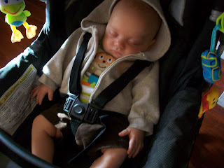 As we sat at the pediatrician's today- going over introducing fruits first, then veggies- I'm thinking- woah! Wait a minute, I was excited about introducing cereal, all of a sudden it seems it's flying by too fast! We had some pats on the back over his growth- he's up to 12 lbs, 8 oz and 23 3/4" - which puts him in the 10th percentile for length and 12th percentile for weigh for a 4 month old... if you consider his adjusted age of about 2 1/2 months, he's right around the 50th percentiles... and has officially (more than) Tripled his birth weight- nice! He's still working on his muscle control and other "developmental" tasks- so he's right on track/ahead for his adjusted age- but it's still hard separating and not expecting him to meet his chronological age goals. But! He's still amazing!!! He gave the doctor big smiles (always with the glasses- they crack him up) and sat inspecting him for a minute- good job kiddo :) Unfortunately had another round of immunizations- so he's passed out now... hoping for an easy time, just gotta stay on top of the Tylenol. Just found out my sister was at the same doctor for Nathan's 2 month checkup, just an hour before us. Lucky me- he got his round of shots too- and yep, I'm watching him tomorrow. Two babies post-shots... oh boy.